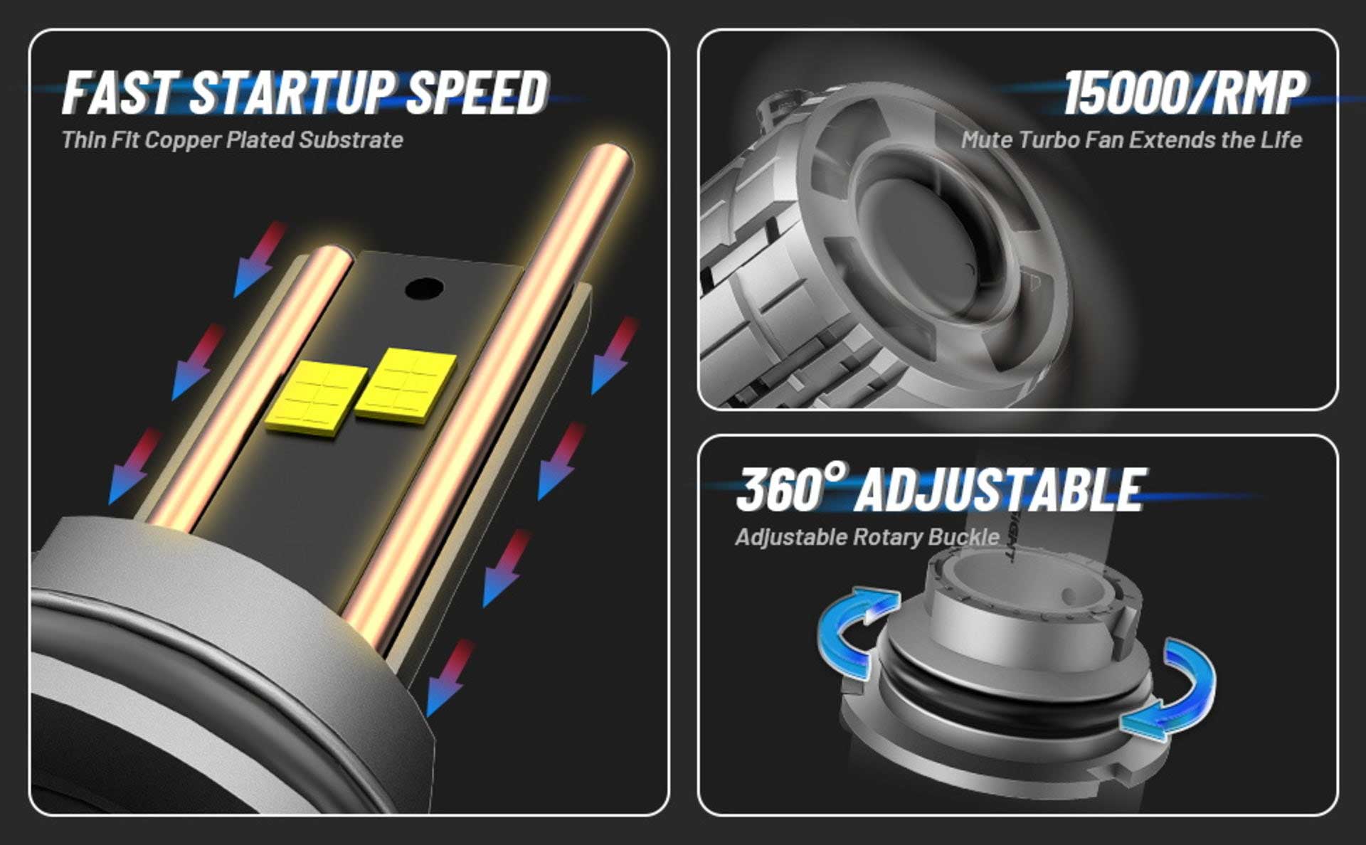 The LED headlights adopt double heat pipe heat dissipation and are equipped with a fan, 600% faster cooling than other headlight bulbs, maximizing bulb life while making sure your high-performing LED bulbs maintain their brightness over time. Our headlight bulbs last up to 100,000 hours, 80 times longer than the halogen!