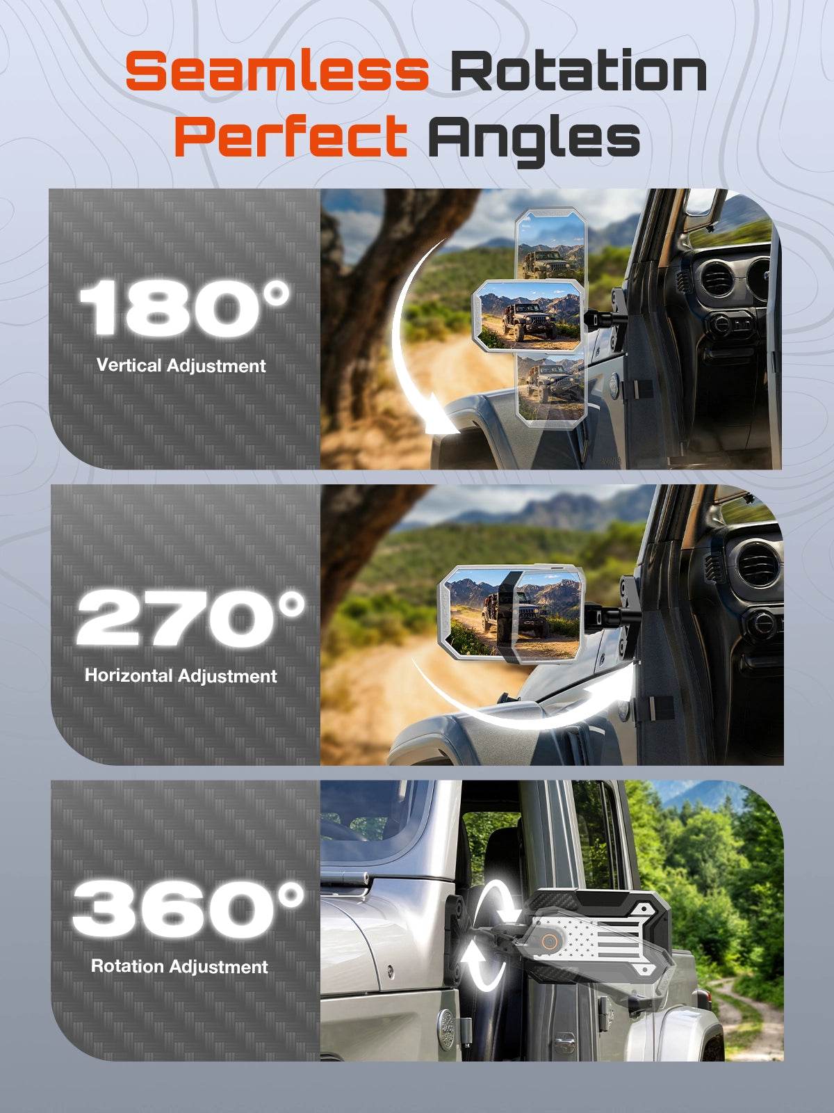 Featuring 360° horizontal rotation and 180° vertical adjustment, these mirrors can be positioned exactly where you need them. Drivers of different heights can easily find their perfect viewing angle. One mirror, custom fit for everyone.