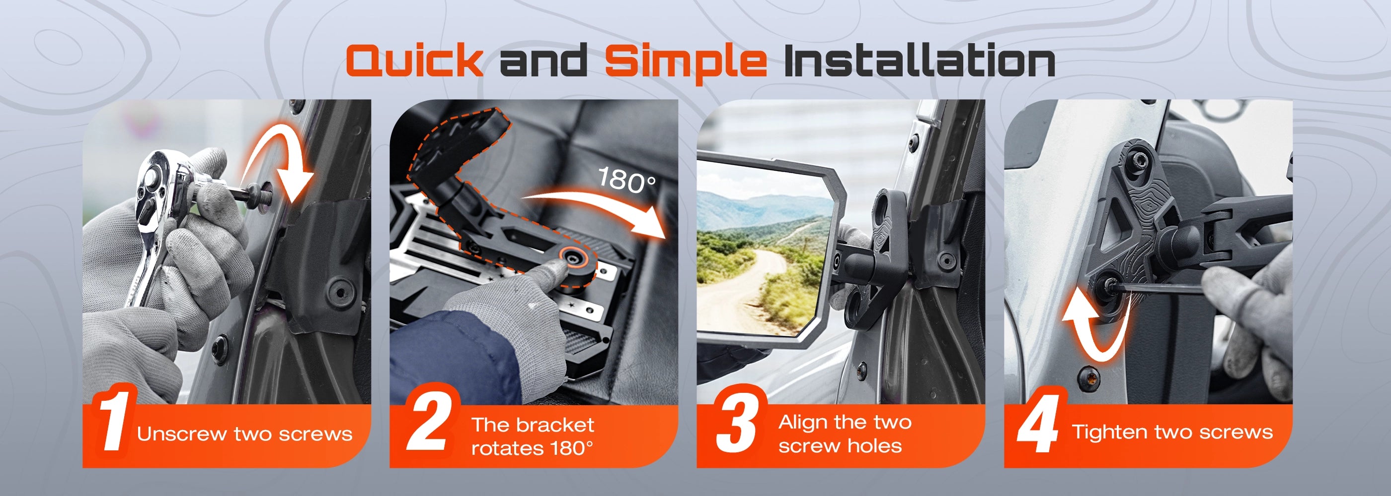 Designed for quick and simple installation, these mirrors can be mounted in about 10 minutes. No complicated tools or drilling required. Spend less time installing and more time driving.