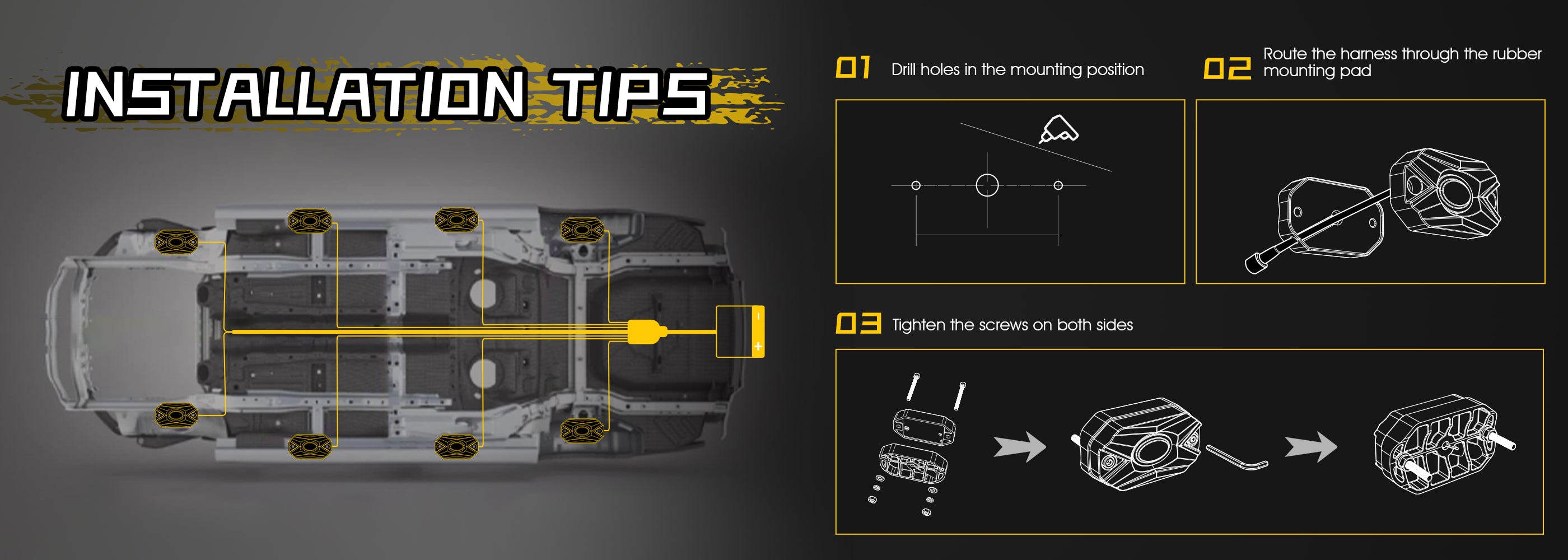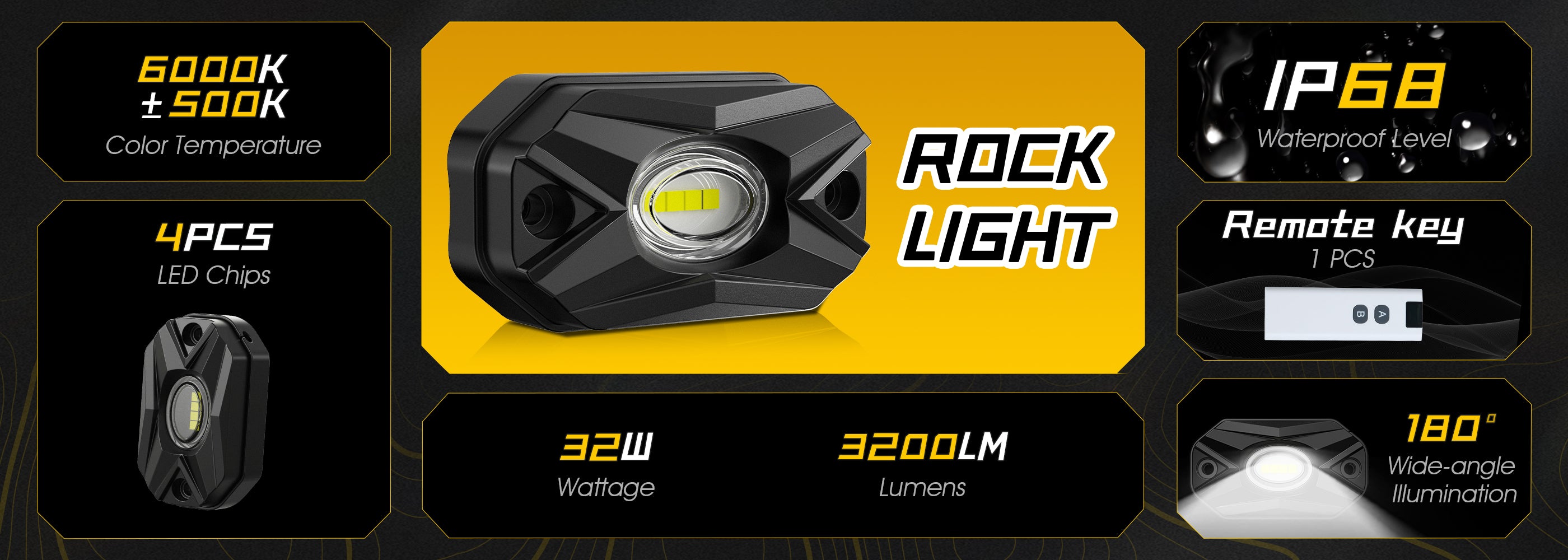 Each set of 8 LED Rock Lights provides up to 64W of power and up to 6400 lms (4 pods provide 32W and 3200 lumens). The white light has a color temperature of 6000K, bright and clear. In flood mode, each pod provides up to 180° wide-angle lighting. Using multiple pairs can greatly expand the lighting range, enhance the visibility of the terrain below the vehicle, and improve driving safety. The Novsight Rock Light housing is made of a strong, deformation-resistant material, making it scratch-resistant and highly durable.