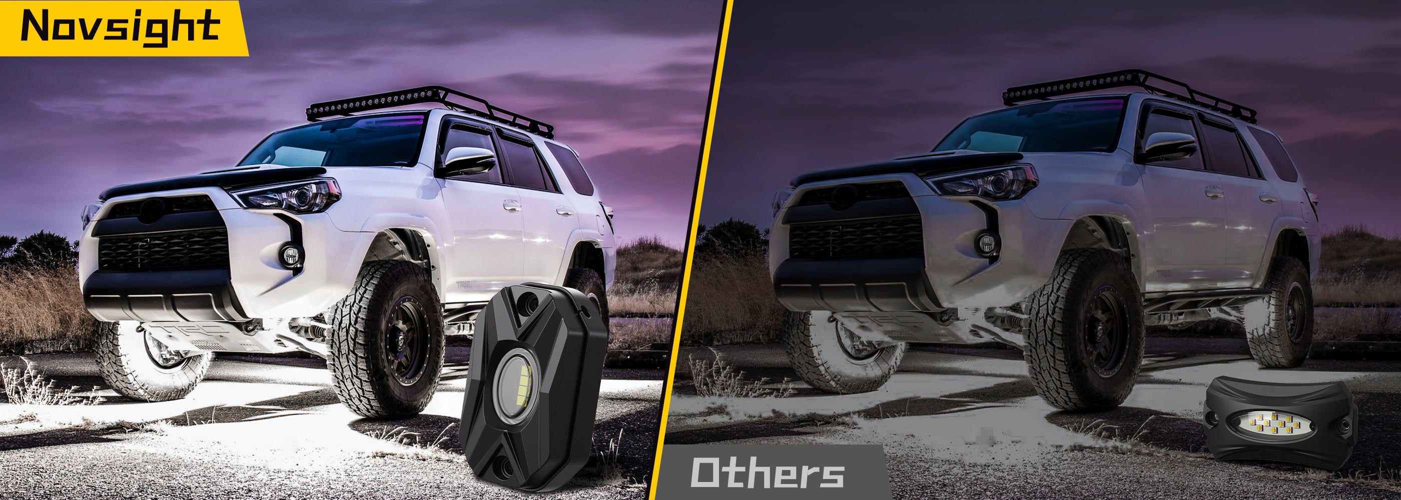 Novsight Rock Light is suitable for a variety of vehicles, including cars, off-road vehicles (such as Jeeps and UTVs), SUVs, and trucks. With excellent lighting performance and high-quality housing, Rock Series rock lights are ideal for use in various weather conditions and challenging roads. They provide reliable and stable lighting to improve driving safety and the overall driving experience.