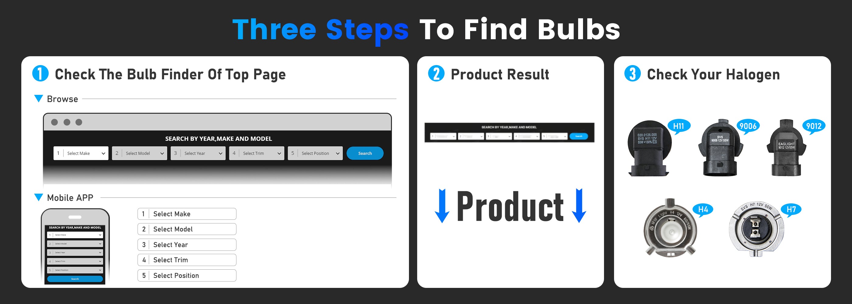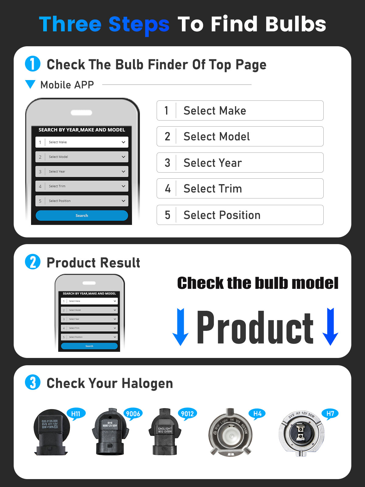 2. Search with Bulb finder online, and enter your vehicle info to find out the correct size.