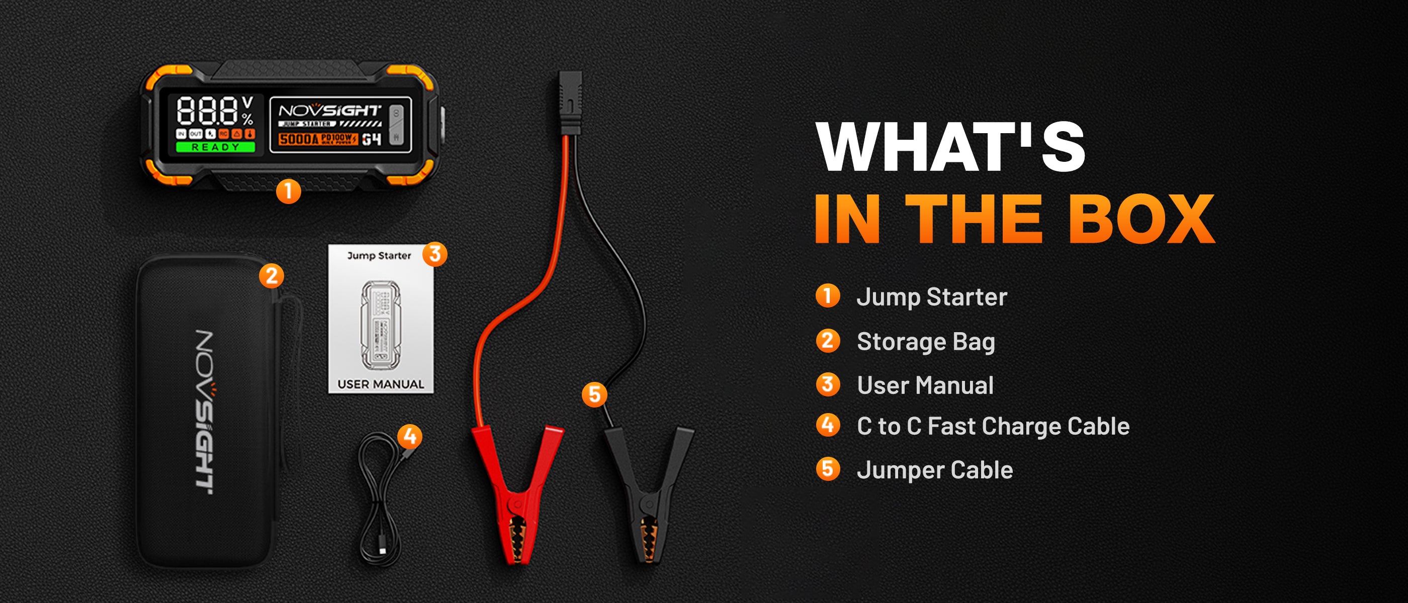 The kit includes heavy-duty jumper cables, a USB charging cable, and a compact storage bag. Its palm-sized design (weighing just 1.5 lbs) ensures effortless portability for storage in your trunk, glovebox, or backpack.