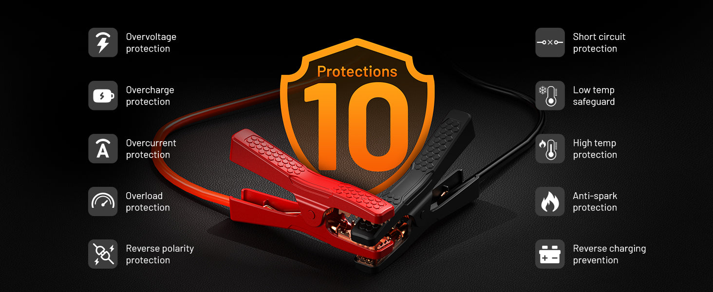 This car jump starter integrates 10 advanced protective mechanisms — including overvoltage, overcurrent, overload, and temperature safeguards — to eliminate risks during operation. Military-grade reverse polarity protection, anti-spark technology, and smart reverse-charging prevention ensure fail-safe performance, even in extreme conditions. Built to exceed industry safety standards, it delivers professional-grade protection that prioritizes your peace of mind.