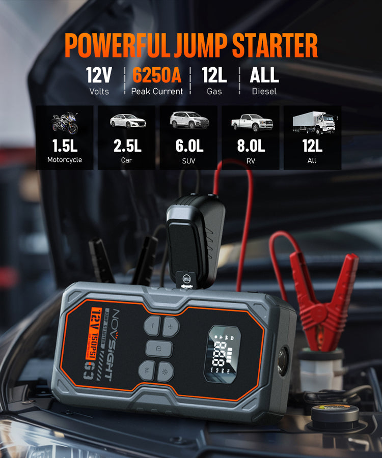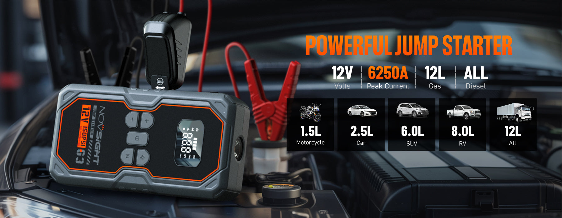 The Novsight 6250A Jump Starter with air compressor supports 12L gasoline vehicles and all diesel engines. Always verify your vehicle’s engine specifications against the product details to ensure compatibility.