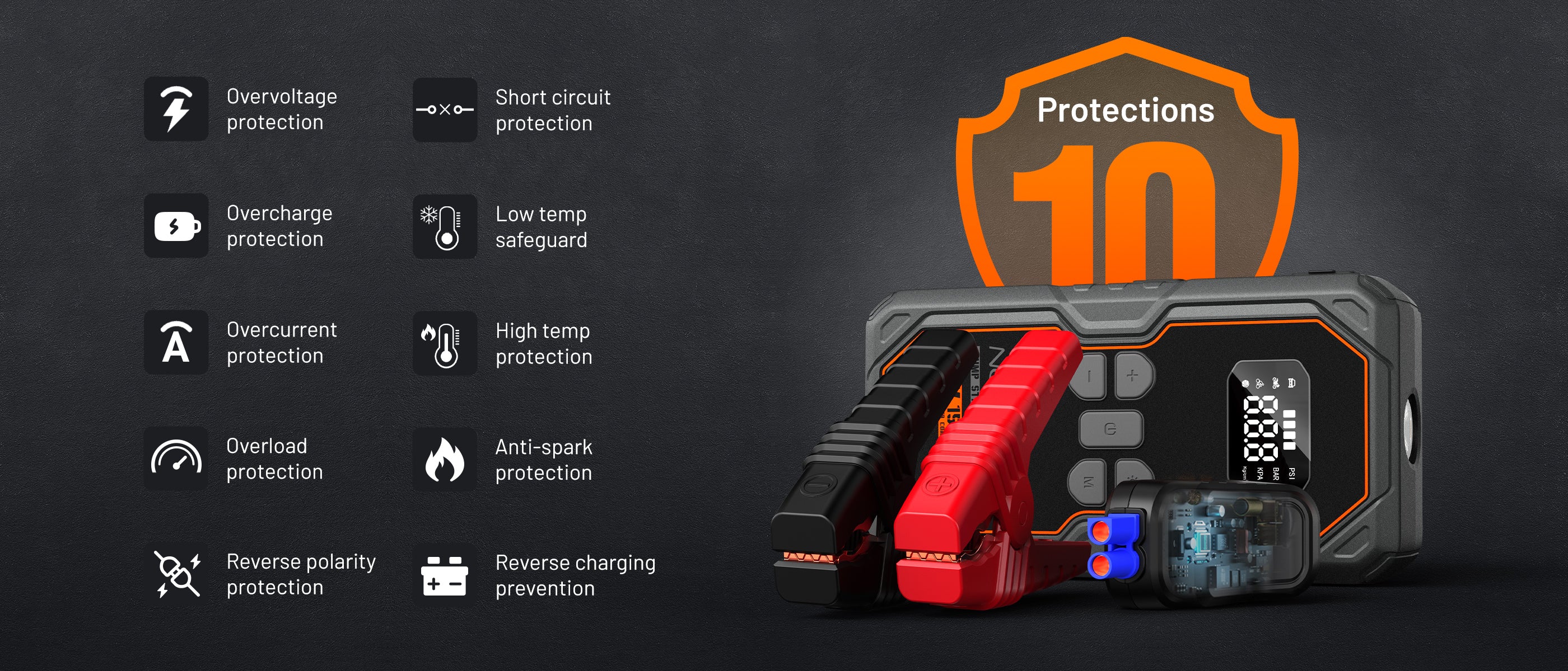 Engineered for extreme reliability, our military-grade thermal resilience (-4°F to 140°F) pairs with a 10-layer defense system—overcharge, overcurrent, short-circuit, reverse polarity, low temp/hight temp/voltage/load safeguards, spark-proofing, and reverse-charge protection. Built to ACE emergency jumpstarts in blizzards or heatwaves (CE/UL-certified).