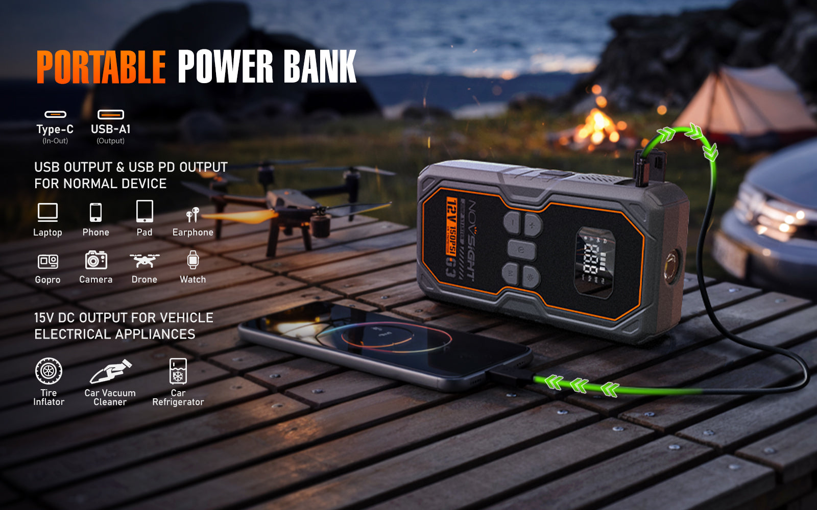 Yes! Integrating 4 thinner, high-capacity battery packs, this portable jump starter can also be used as a long-lasting power bank to charge any personal mobile device, such as smartphones, tablets or other USB devices. It can be used instead of professional power banks.