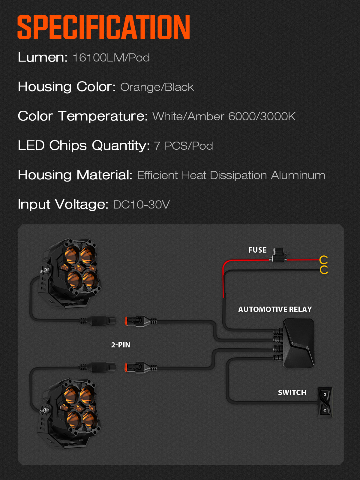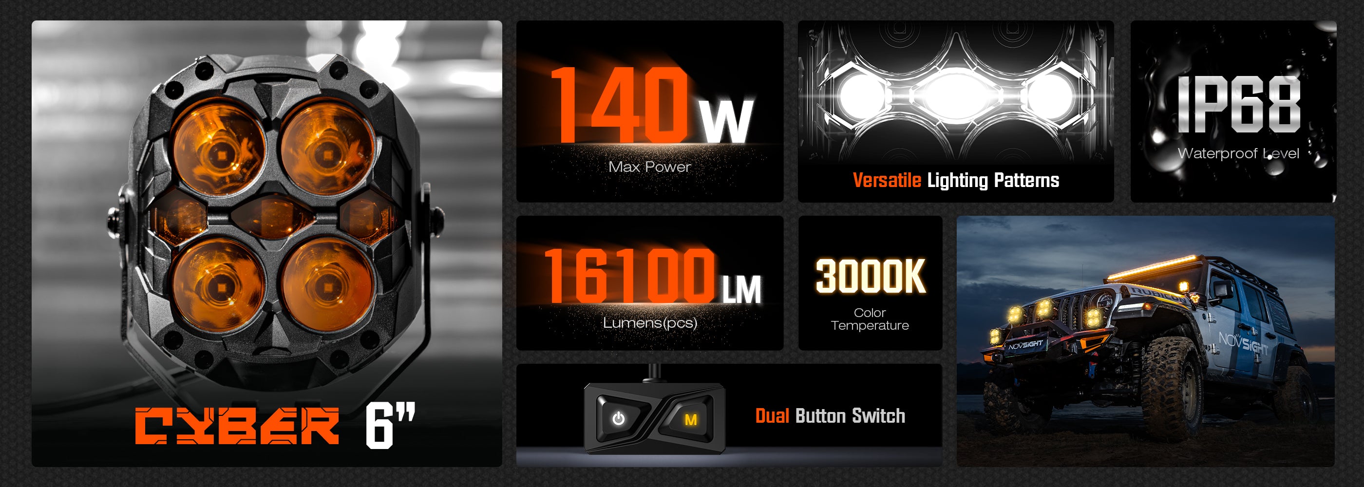 The ultimate lighting solution for off-road enthusiasts who value performance and unique design. Available in 1 colors, Cyber 6-inch led pods features 7 LED beads, 140W of power, and 6 lighting modes to enhance your off-road experience in any weather, day or night. With Cyber6, get closer to nature, challenge your limits, and enjoy unparalleled convenience.