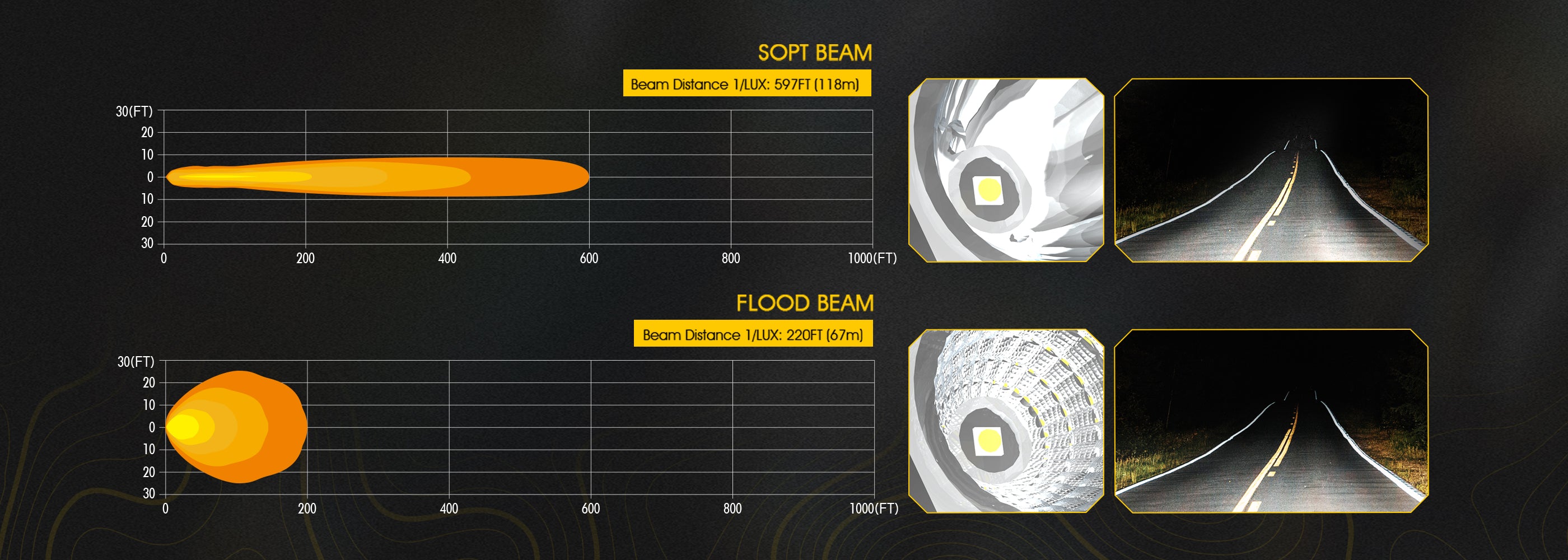 Spot Beam:The spot mode off-road light provides concentrated illumination up to 597 FT, with a beam width of 20 FT. It’s perfect for long-range, precise lighting needs.