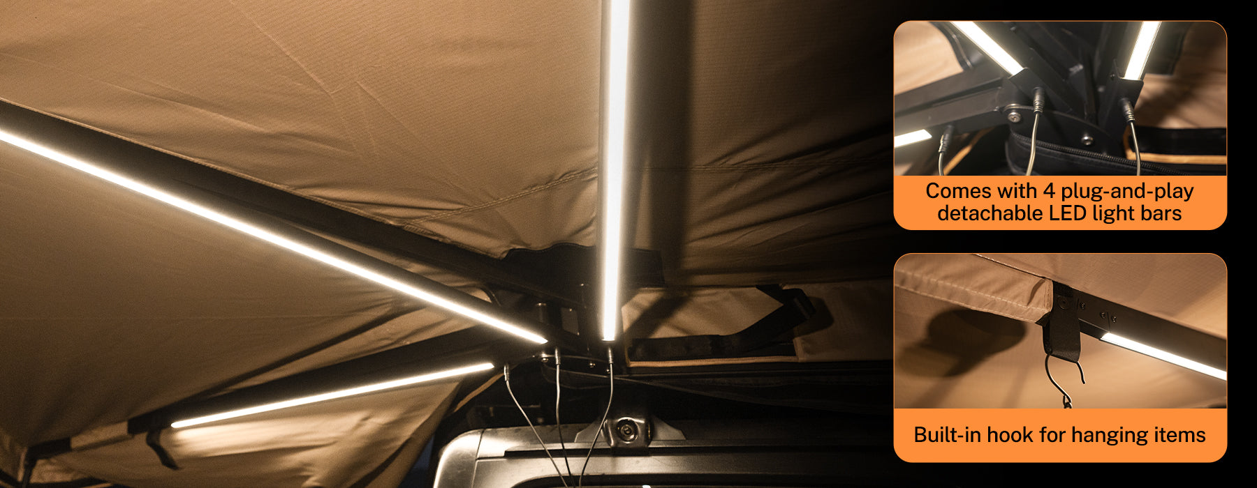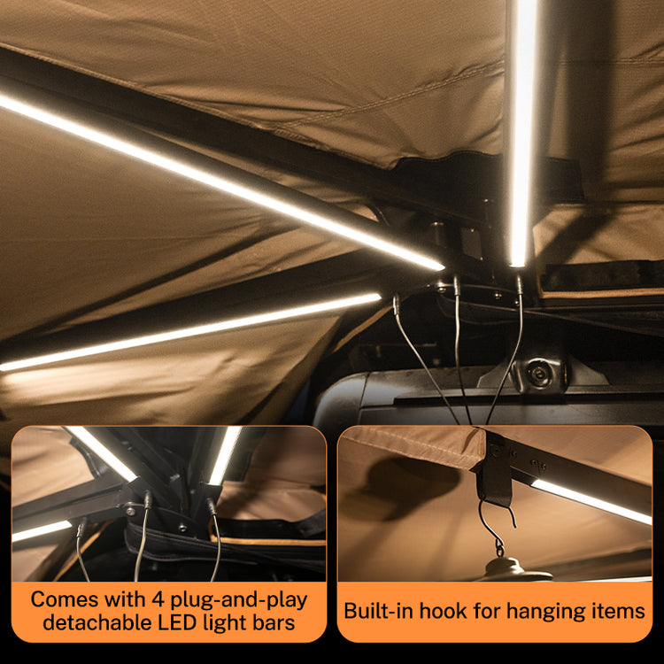 The outer tent of the 270-degree Awing is made from 600D Oxford fabric. Its 270-degree design provides extensive sun protection and a larger shaded area, with a UV rating of 50+ that blocks up to 99% of ultraviolet rays.
