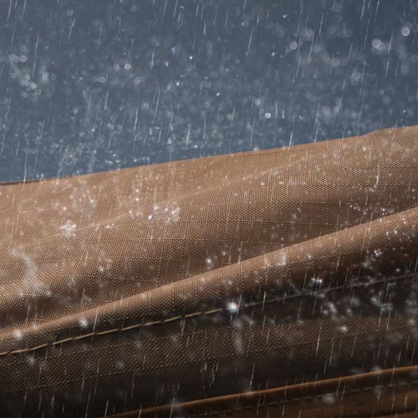 The 600D Oxford fabric features waterproof, breathable, and windproof properties. Its smooth surface allows water droplets to roll off effortlessly without leaving any traces or penetrating the fabric. The waterproof rating can reach up to PU2000mm.