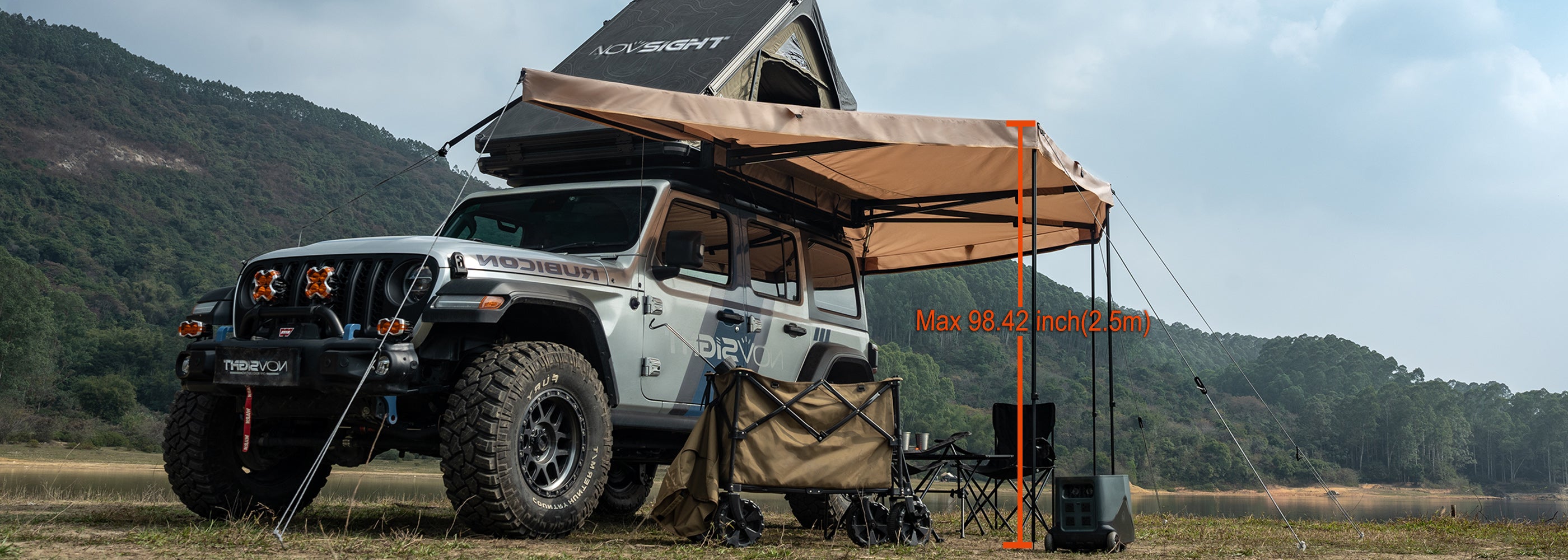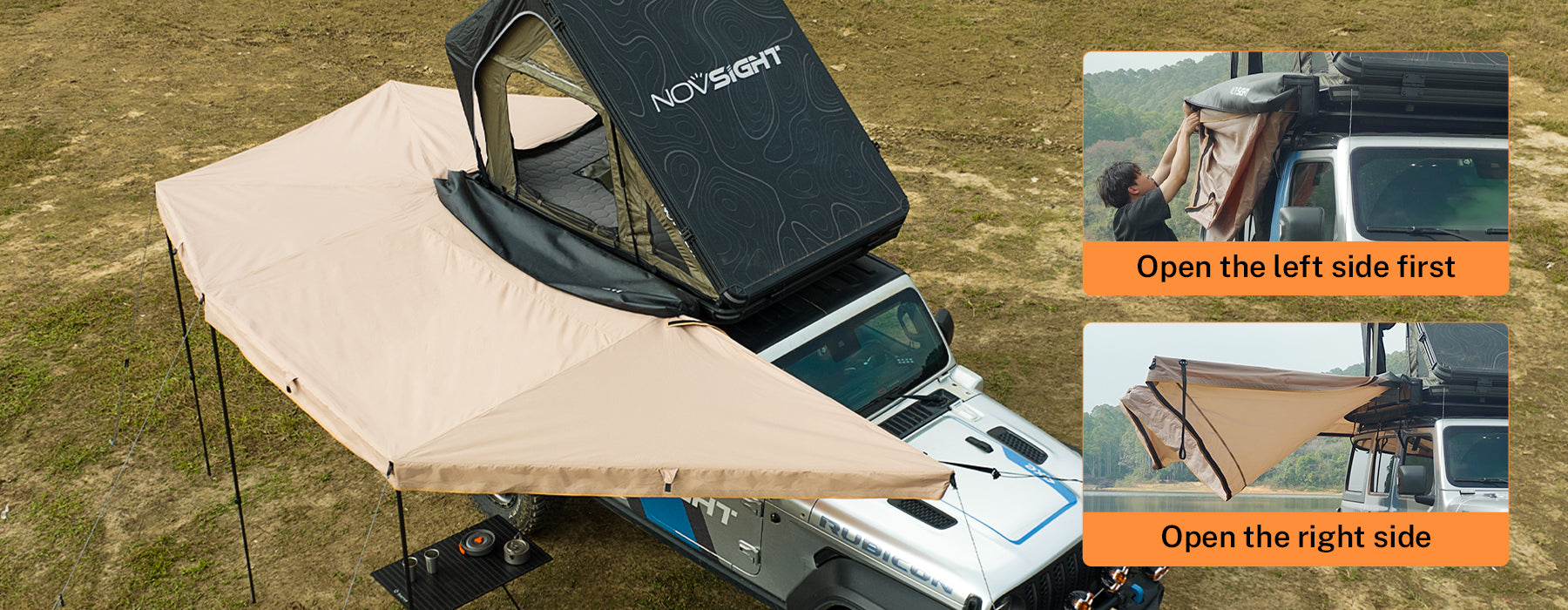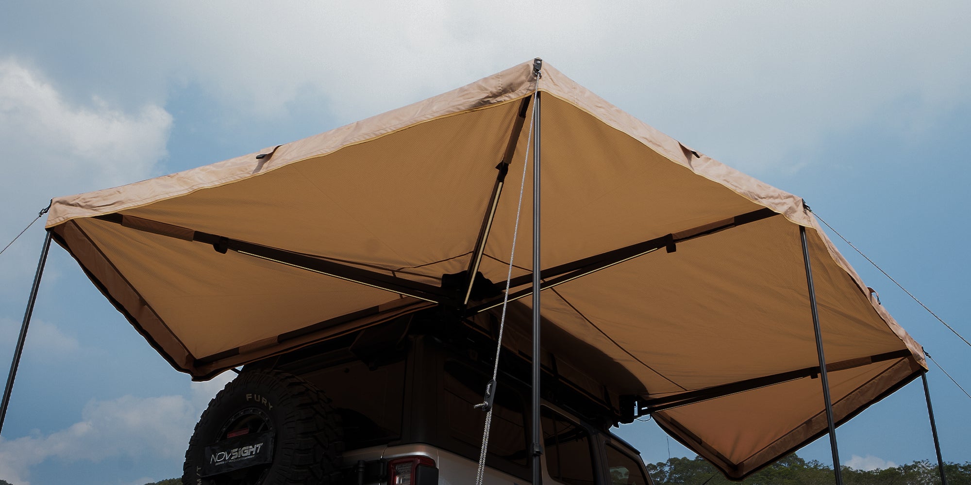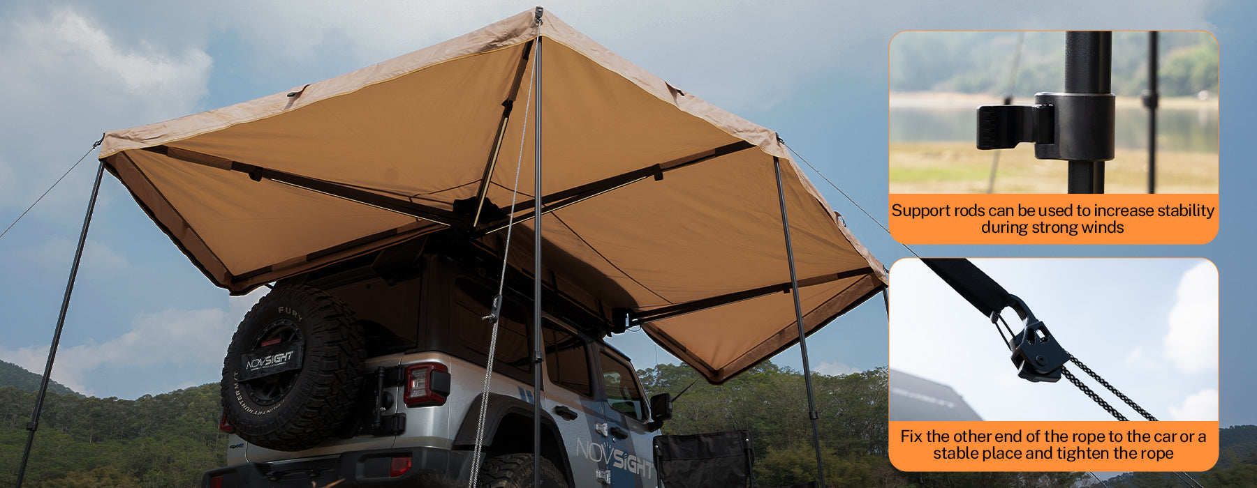 Novsight introduces 270-degree batting side awning, providing extensive sunshade coverage. Made of high-quality 600D Oxford cloth, it can effectively block harmful UV rays and prevent rain penetration. The top of the awning is reinforced with solid aluminum alloy, forming four stable triangle structures to resist strong winds and ensure safety. Available in left and right styles, scroll down for more details.