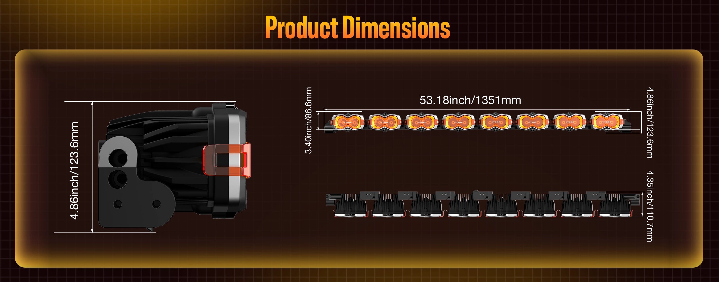 The Halo 4.5-inch Pod Light Combo 50-inch Bar redefines off-road lighting by combining eight individual pod lights into one groundbreaking unit. Each end features one Halo 4.5-inch LED pod lights in flood beam, while the center is equipped with six pods in spot beam. This thoughtful combination (Spot Beam+Flood Beam)maximizes the performance of the Halo 4.5-inch pods by seamlessly integrating different beam patterns.