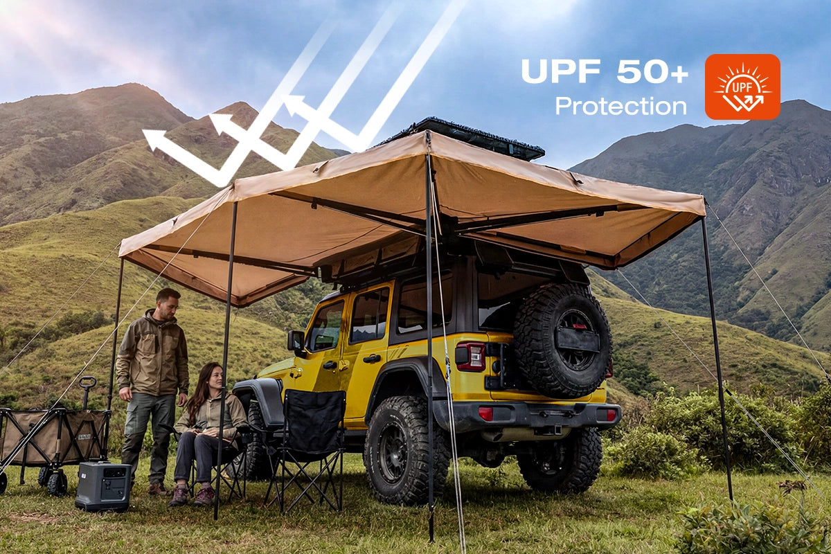 Built for long days outdoors, the 270° awning uses durable 600D Oxford fabric to create a wide, wrap-around shaded zone. Whether you’re camping, overlanding, or parked trailside, it delivers UV50+ protection that blocks up to 99% of harmful rays, keeping you cool and protected from harsh sun.
