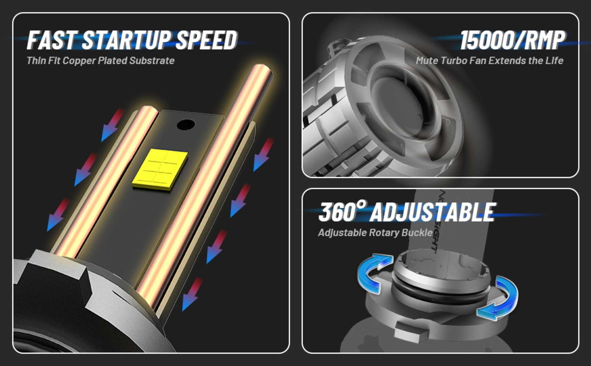 The LED headlights adopt double heat pipe heat dissipation and are equipped with a fan, 600% faster cooling than other headlight bulbs, maximizing bulb life while making sure your high-performing LED bulbs maintain their brightness over time. Our headlight bulbs last up to 100,000 hours, 80 times longer than the halogen!