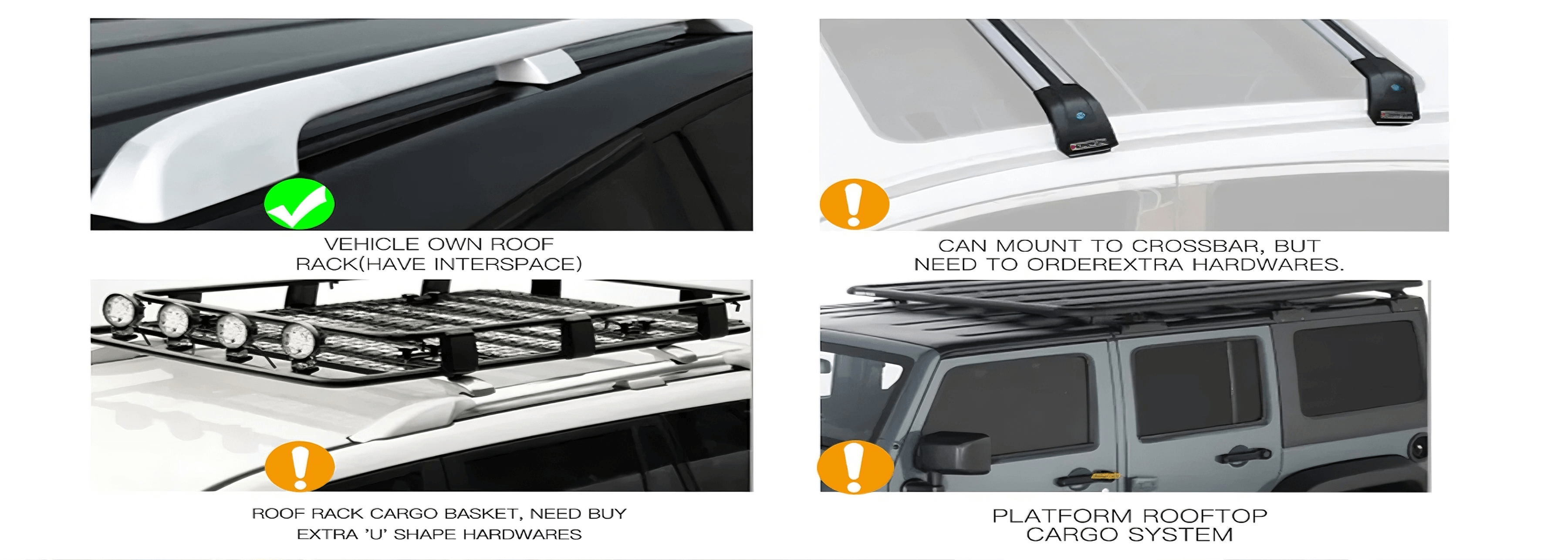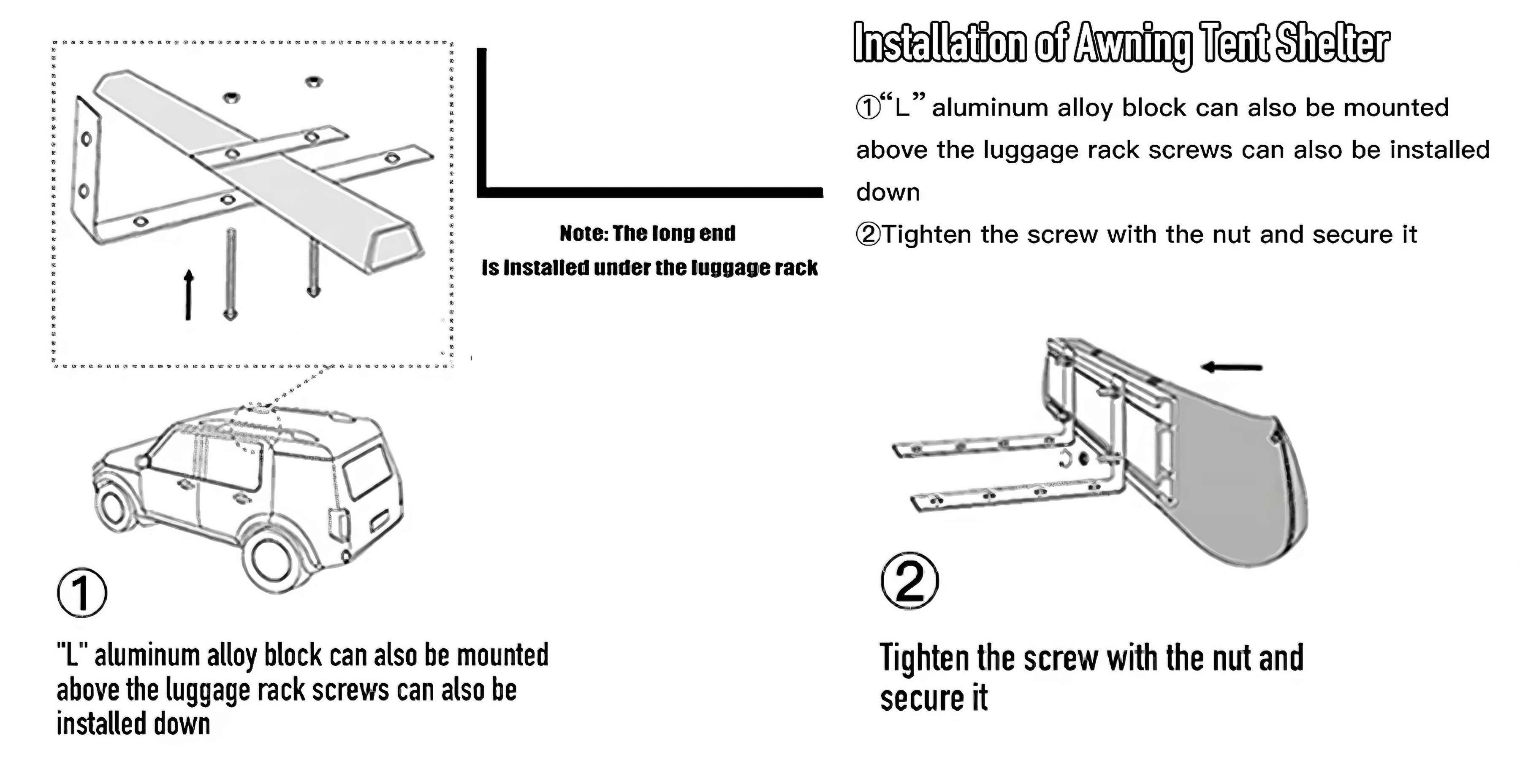The package includes two sets of brackets that can be assembled into L-shaped mounting brackets for secure installation. Please note that your roof rack must have adequate clearance to allow the L-shaped brackets to slide into the gap between the rack and the vehicle roof for proper mounting.