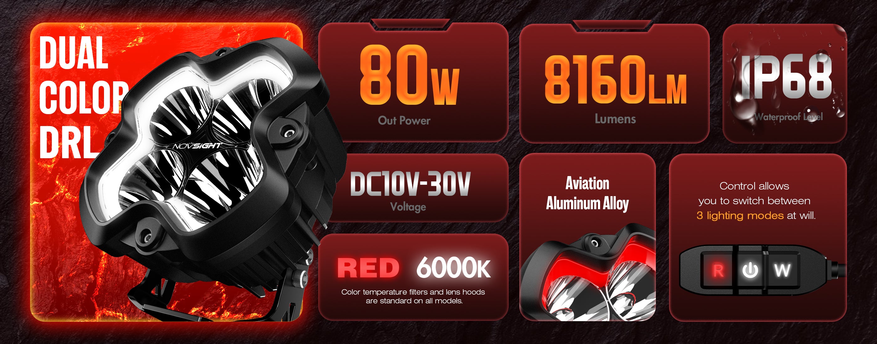 Engineered for fearless off-roaders, the HALO SE LED pod lights combine fierce performance with standout style. Featuring a striking red housing and dual-color daytime running lights (white/red), they offer superior visibility and a bold, aggressive look. Whether you're navigating shadowy forest trails or powering through rugged terrain, HALO SE helps your vehicle command attention. Add multiple sets to amplify the impact and make your ride truly unforgettable.